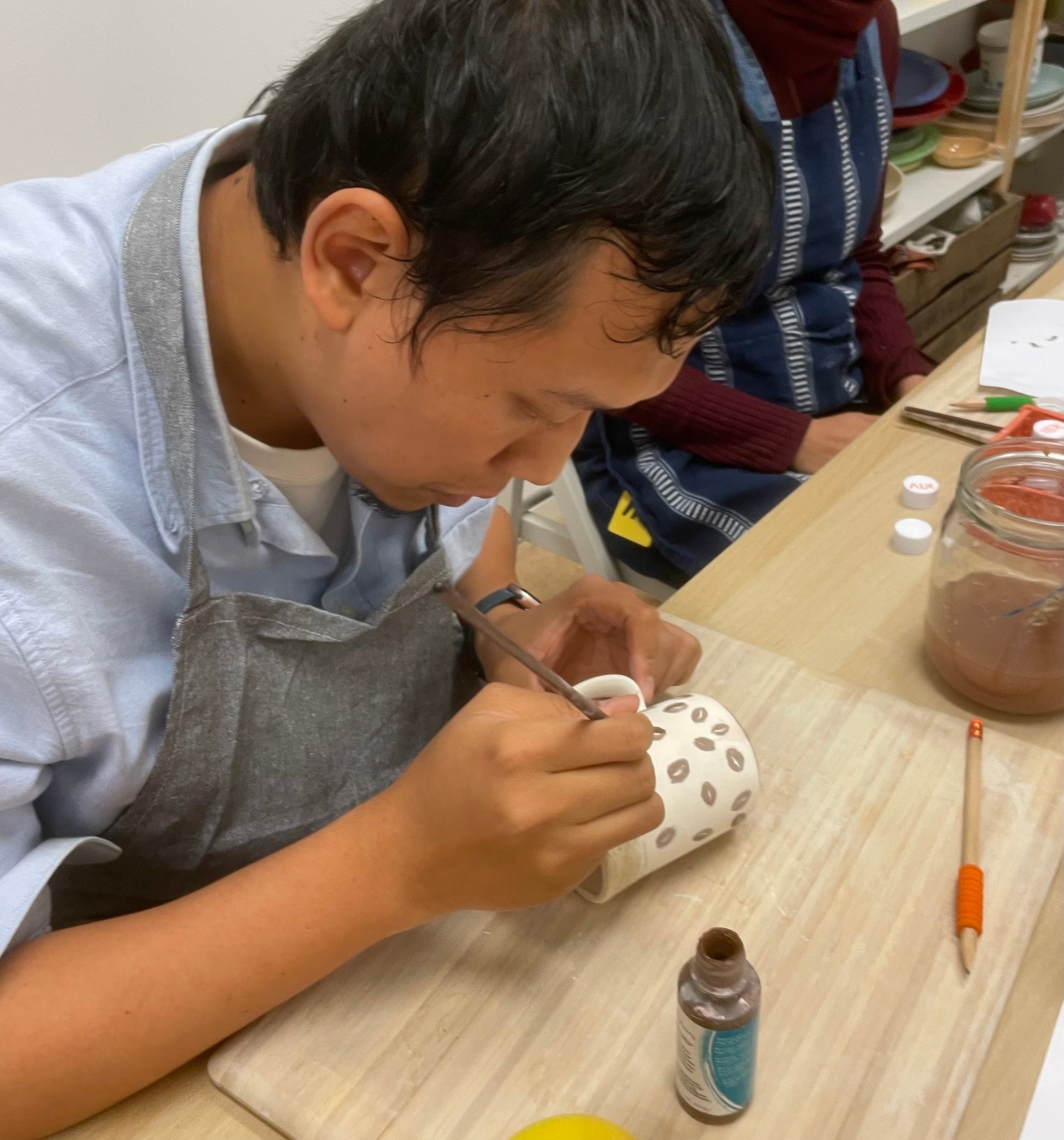 - All materials and tools, including glazes, brushes, and everything you need to paint + an apron to protect your clothes from getting dirty!