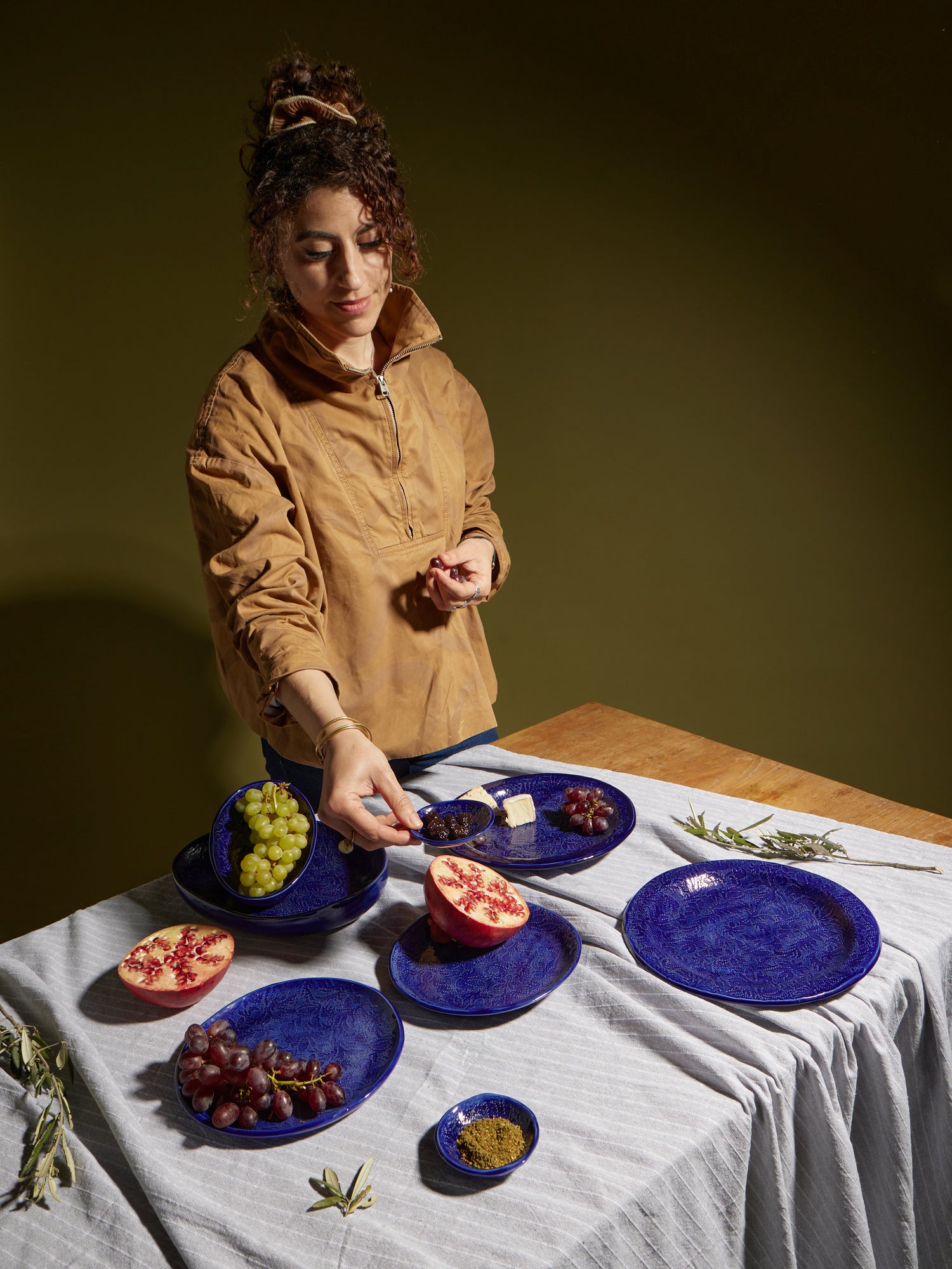 Turabi, which means 'my soil' or 'my earth' in Arabic, is a ceramic studio in Amsterdam, founded by Jerusalem born Inas Halabi. One of the main inspirations behind Turabi is Palestinian embroidery, known as Tatreez, where various patterns are hand-carved into the clay, creating pieces that are both decorative and functional. These designs carry the symbols and stories of Palestine, preserving our rich heritage. Turabi also features ceramic designs inspired by the natural tones of Mother Earth and lace-adorned motifs inspired by the blue hues of the Mediterranean Sea.
